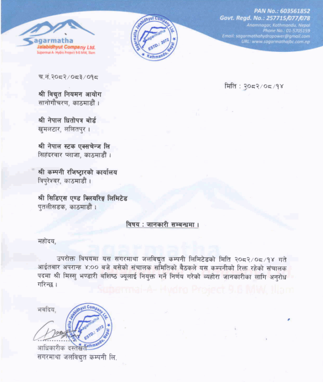 सगरमाथा जलविद्युत कम्पनीको सञ्चालकमा मिस्सु भण्डारी बशिष्ठ नियुक्त