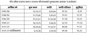 ५ वर्षको राजस्व परिचालनको तुलनात्मक अवस्थालाई हेर्दा आर्थिक वर्ष २०७६-७७ मा ११ खर्ब १२ अर्ब ३ करोड रुपैयाँ लक्ष्य रहेकोमा ७१.३८ प्रतिशत प्रगति भएको थियो । त्यसैगरी आर्थिक वर्ष २०७७/७८ मा १० खर्ब ११ अर्ब ७६ करोड रुपैयाँ लक्ष्य रहेकोमा ९२.५० प्रतिशत प्रगति हासिल भएको थियो । आर्थिक वर्ष २०७८/७९ मा ११ खर्ब ८० अर्ब ६० करोड रुपैयाँ राजस्व संकलनको लक्ष्य रहेकोमा ९०.२४ प्रतिशत प्रगति हासिल भएको थियो ।