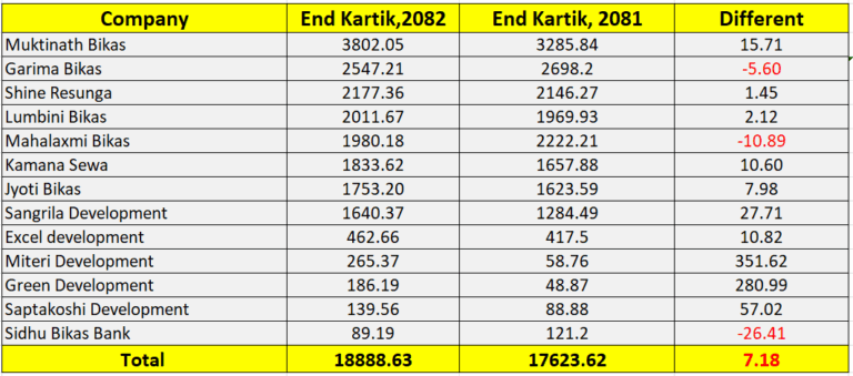 यस्तै, कात्तिक मसान्तसम्म आइपुग्दा कुमारी बैंकले ९ अर्ब ९८ करोड ७६ लाख, प्राइमले ९ अर्ब ८७ करोड ७७ लाख, सिद्धार्थले ८ अर्ब ८७ करोड १४ लाख, लक्ष्मी सनराइजले ८ अर्ब २७ करोड ६८ लाख, राष्ट्रिय वाणिज्य बैंकले ७ अर्ब २० करोड २७ लाख, प्रभूले ६ अर्ब ६८ करोड ७८ लाख, सिटिजन्सले ६ अर्ब ३६ करोड २८ लाख रुपैयाँ बराबरको सेयर कर्जा प्रवाह गरेका छन् ।